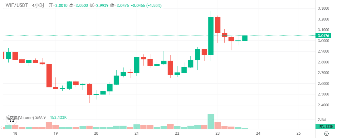 $WIF WIF is one of the most popular memecoins in the Solana ecosystem and has seen a 5.50% increase in the last 24 hours. WIF has had an impact not only on memecoins in the Solana ecosystem, but also on a large portion of the category and seems to be mentioned frequently in this bull run.