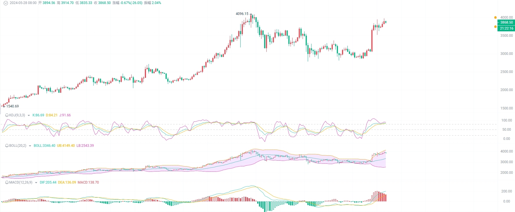 Looking at the market, as of press time, Ethereum was around 3870, yesterday's highest point was around 3980, and the lowest point was around 3820. Today's market has pulled back to yesterday's lowest line. If there is a rebound trend, it is possible to pull back to the support point near 0.618 to defend a wave. The EMA trend indicator continues to be bullish, and the EMA15 fast line has reached around 3570 and will continue to stretch. It can continue to explore temporarily and is expected to reach around 3660. The KDJ was blocked by the 3980 pressure level and fell downward. The trend reversed at a high level, and the MACD began to decline with a large volume. The K-line divergence indicator began to appear, indicating that there will be a large-scale wash in the next half month or so. In the short term, there will be a wave of highs to the 4000 mark, which is likely to break but not too high. The upper track of the Bollinger Band opening has moved up to around 4150, and the bottom support has raised the K-line. Don't lose yourself in the oscillating upward.