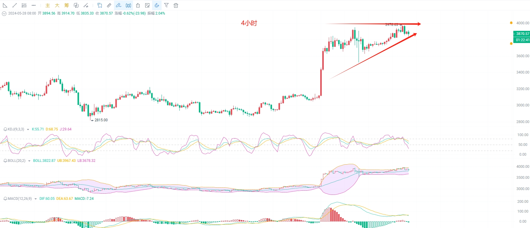 Everyone has seen the layout ideas of Ethereum yesterday. The article mentioned the layout of 2824 long orders at the current price. After breaking 3900, half of the profit was taken out, and nearly 100 points of space were taken. The remaining half was held at the target of 4000. There were some discrepancies with the expected market. It did not reach the 4000 mark and directly stepped back to the golden section line of 0.786. The original position was 3%, and 1.5 was taken out of profit. The remaining 1.5 positions had been left before the press release.