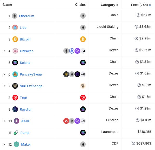 Here’s The Top 12 Entities By 24 Hour Fee Generation (from @DefiLlama):