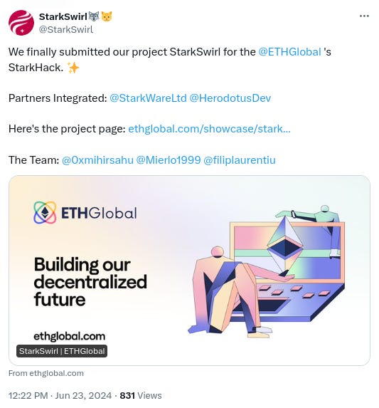-Something new called @StarkSwirl. Twitter bio states “World's first fully decentralized, non-custodial privacy protocol on @Starknet using zk-STARKs to anonymize transactions and enhance confidentiality.” Followed by 2 of our mutuals. h/t @AresLabs_xyz: