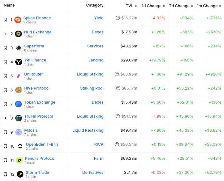 Here’s The Top 12 Fastest-Growing Protocols By TVL On The Weekly With At Least $10M TVL (from @DefiLlama):
