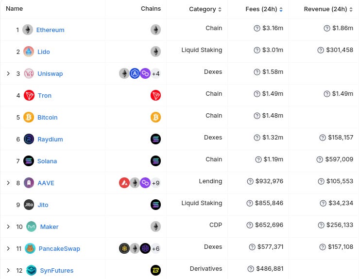 Here’s The Top 12 Entities By 24 Hour Fee Generation (from @DefiLlama):