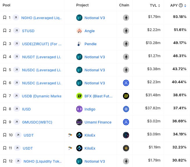 (note: these are the top Stablecoin Yields, sourced from @DefiLlama ($10M+ TVL, single-exposure, and no-IL only) and @stable_fish - note: these lists are just raw data, make sure to always DYOR before interacting with any/all protocols)