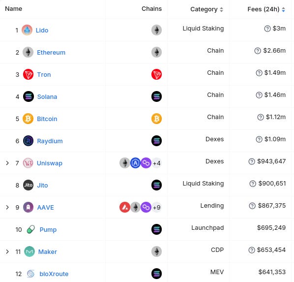 Here’s The Top 12 Entities By 24 Hour Fee Generation (from @DefiLlama):