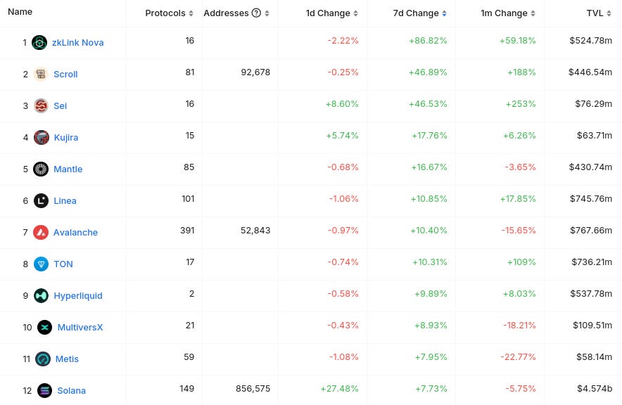 Chains are mostly red today. Only top 30 chains green on the daily are Solana (#4), and Cardano (#29).