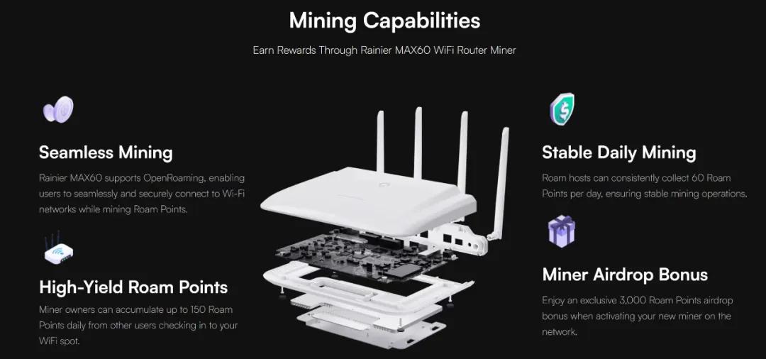 Configure and deploy WiFi mining equipment, that is, buy a Roam router for mining. The Rainier MAX60 currently on sale on the official website is the latest WiFi6 router. After being equipped, it can provide high-speed and high-security WiFi while having mining functions. The daily mining income is higher, and the burning pool set up for miners will have a higher weight ratio when burning Roam Points to exchange for $ROAM.