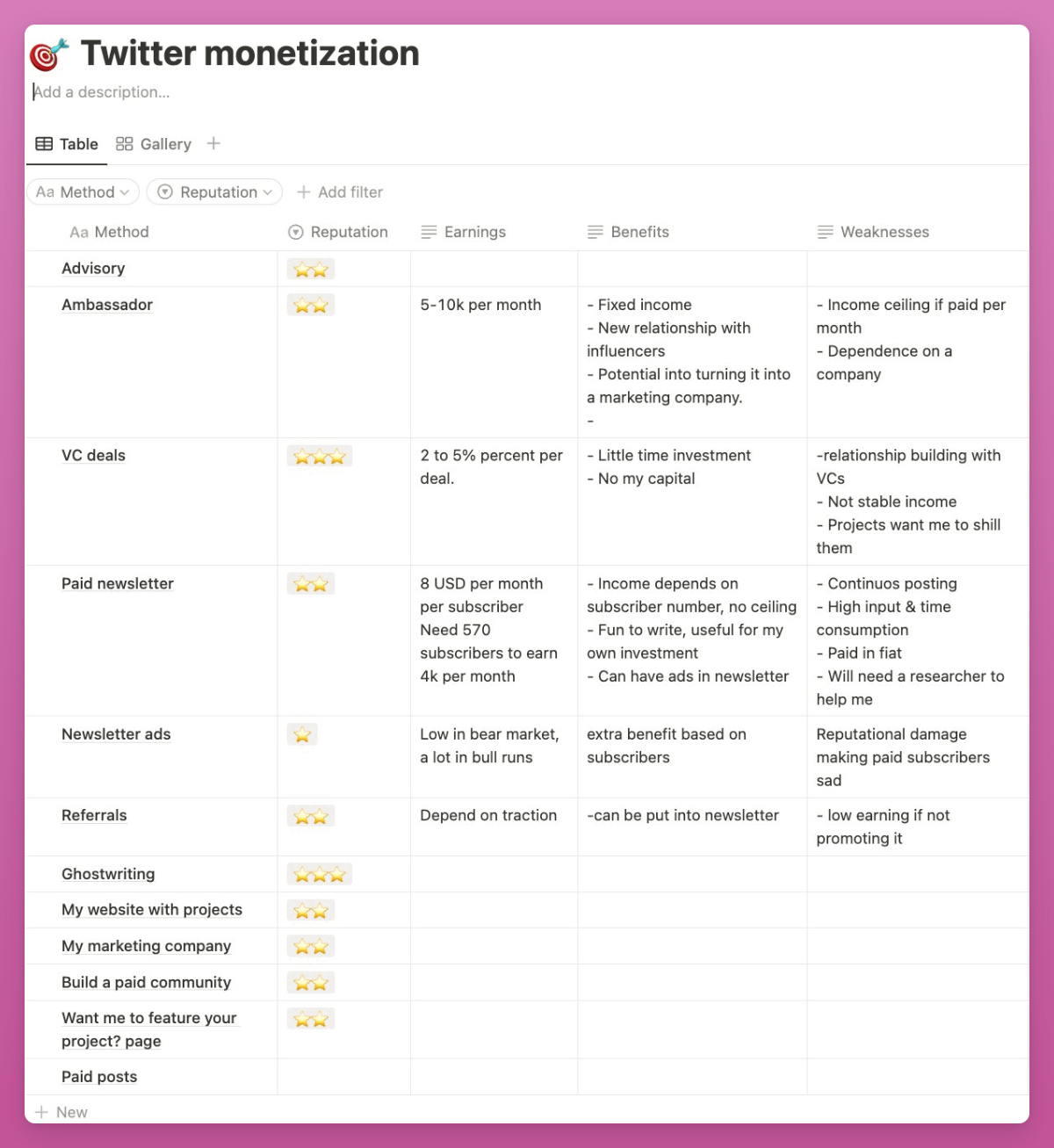 I went to a cafe, opened a Notion sheet, and listed all the popular models that influencers use to monetize. My first idea was sourcing deals for VCs as I get to know great protocols in the space. Long story short, I ended up with a blog, referrals, ambassadorship at Instadapp, and launching my KOL marketing agency Pink Brains.