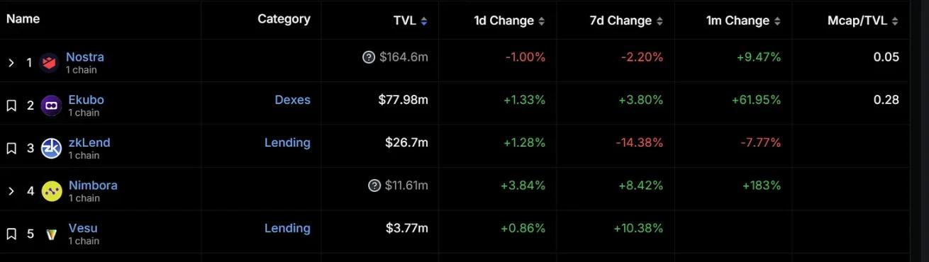 In terms of ecological progress, the Starknet ecosystem has currently integrated more than 100 applications. The top five projects in terms of total locked value on Starknet are all Starknet native projects. The first one is the lending protocol Nostra, with a locked value of US$164.6 million; The second place is the decentralized exchange Ekubo, whose TVL has increased by 61.95% in the past month. It is currently $77.98 million; the third place is the lending protocol zkLend, with a TVL of $26.7 million. However, there are more than 10 million in the Starknet ecosystem. There are only four projects with a TVL in US dollars, and the fifth-ranked lending protocol Vesu has a TVL of only US$3.77 million.