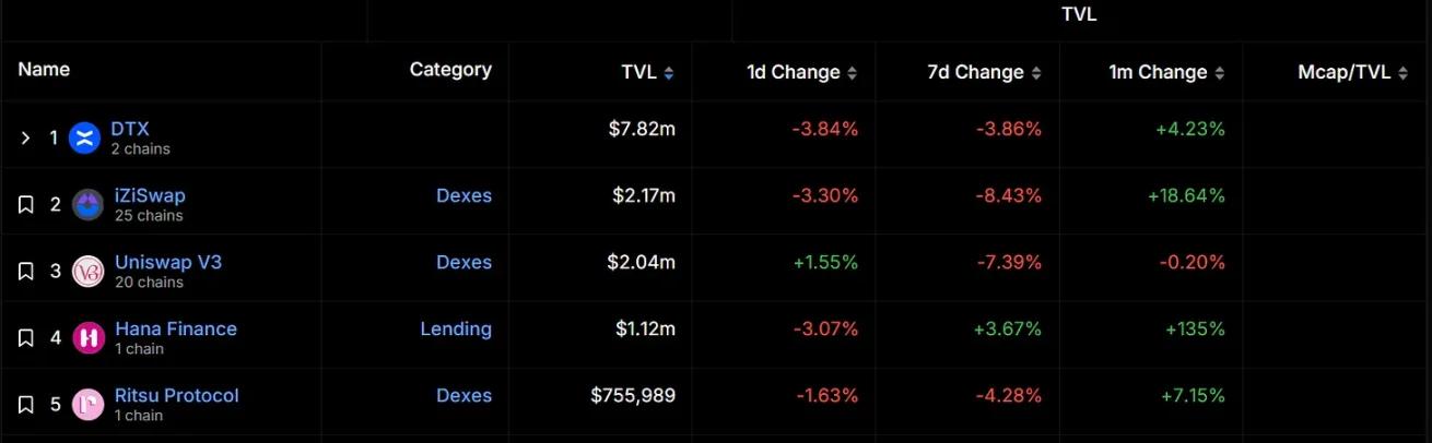 According to DeFiLlama data, Taiko's top three projects in terms of total locked value are DTX, a decentralized perpetual trading platform, iZUMi Finance's multi-chain DEX platform iZiSwap, and Uniswap V3. Overall, the TVL of Taiko's ecological projects is not high. , and DTX occupies a relatively significant market share.
