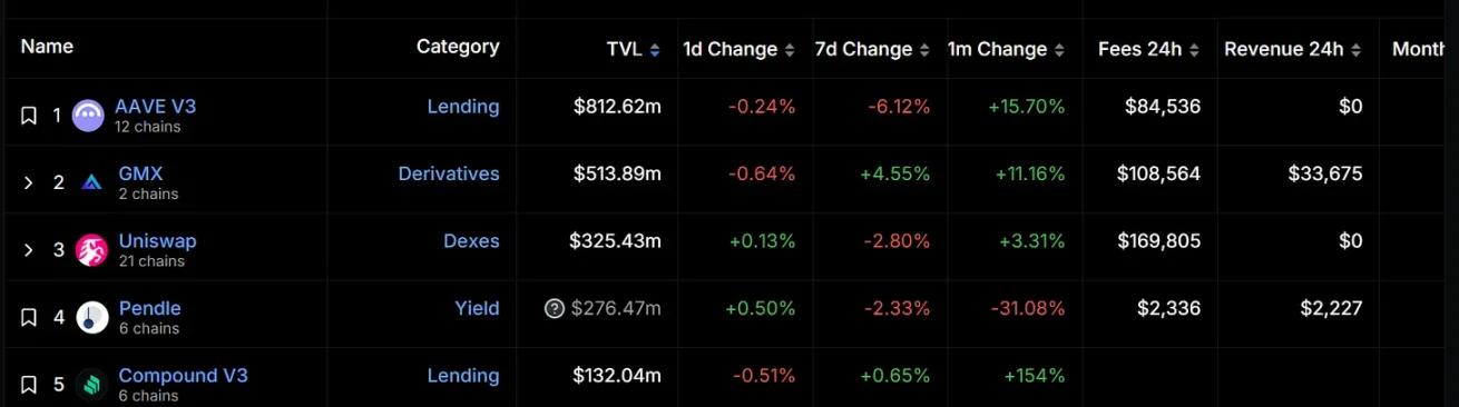 Since the beginning of 2024, Arbitrum's total locked value has remained at the leading level. As of July 28, Arbitrum's TVL reached approximately US$17.15 billion, ranking first, accounting for approximately 40% of the market share, far exceeding the second-ranked According to DeFiLlama data, the project with the highest total locked value on Arbitrum is AAVE, with a locked value of US$812.62 million, followed by GMX and Uniswap, with US$513.89 million and US$325.43 million, respectively.