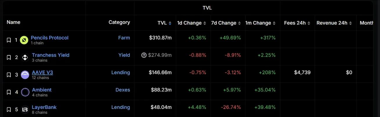 According to DeFiLlama data, the project with the highest total locked value on Scroll is its native project Pencils Protocol, with a locked value of $310.87 million, an increase of 317% in the past month. It is US$769.02 million, and the total locked value of the top three projects in its ecosystem accounts for more than 95% of the market share.