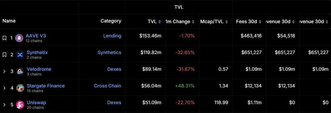 Optimsim currently ranks third in total locked-in volume. It reached its highest point in the first half of the year on March 10, 2024, and then fell back slightly, but was generally stable, and was eventually surpassed by Base in June. According to DeFiLlama data, the Optimism ecosystem The top three projects in terms of TVL are AAVE v3, Synthetix and Velodrome. However, in the past month, the TVL of these projects has shown a downward trend.