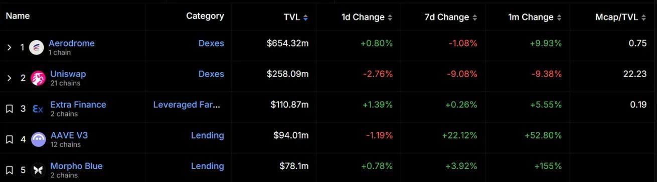 According to DefiLlama data, the current DeFi TVL on Base is $1.67 billion, of which native DeFi projects dominate, including Aerodrome ($654 million) and Extra Finance ($110 million). Aerodrome is currently the most locked-in project on the Base chain. dApp, more than double the lead of the second-ranked Uniswap.