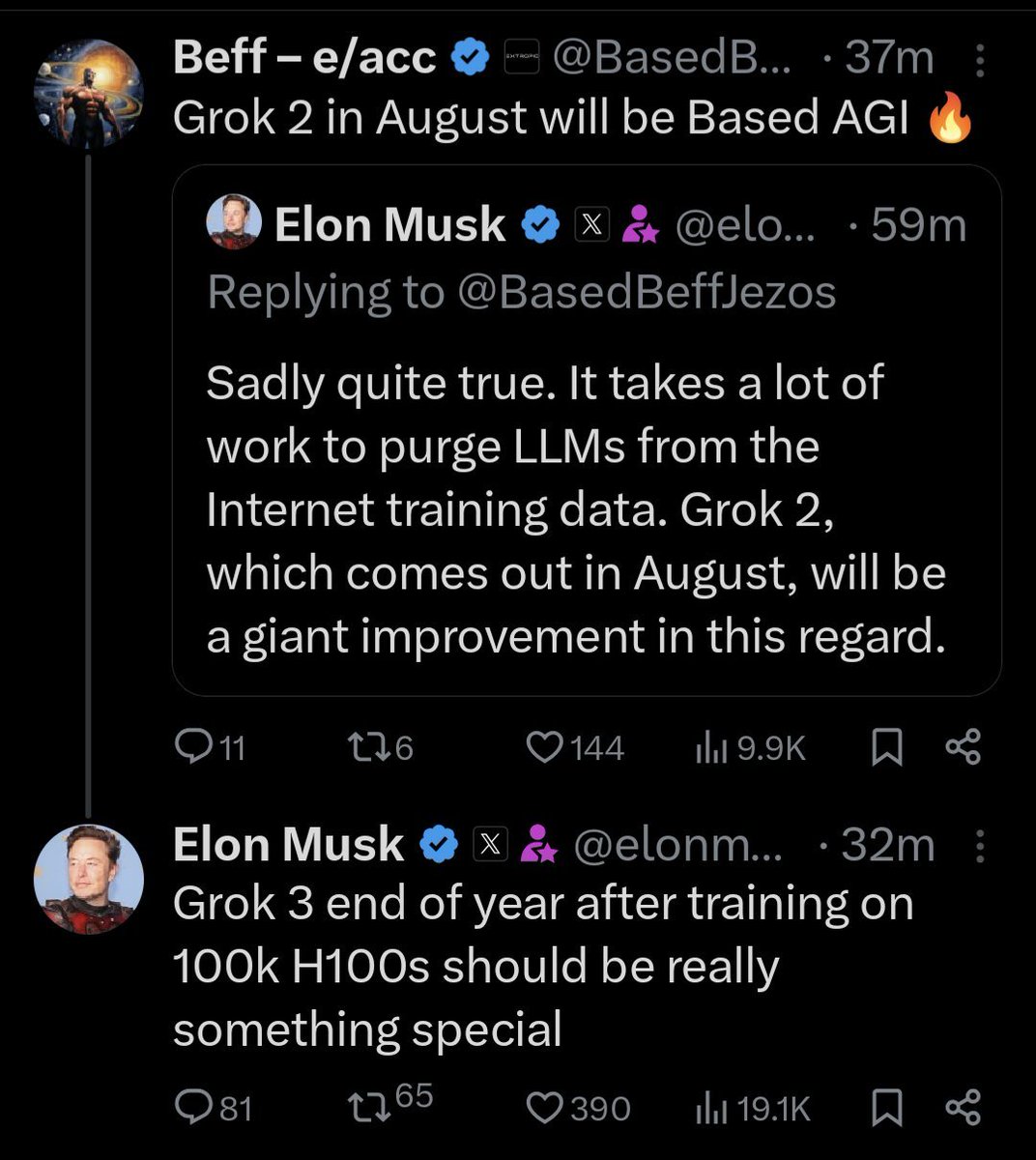 11. Elon announces Grok 2 (coming in August) and 3 (coming in December.)