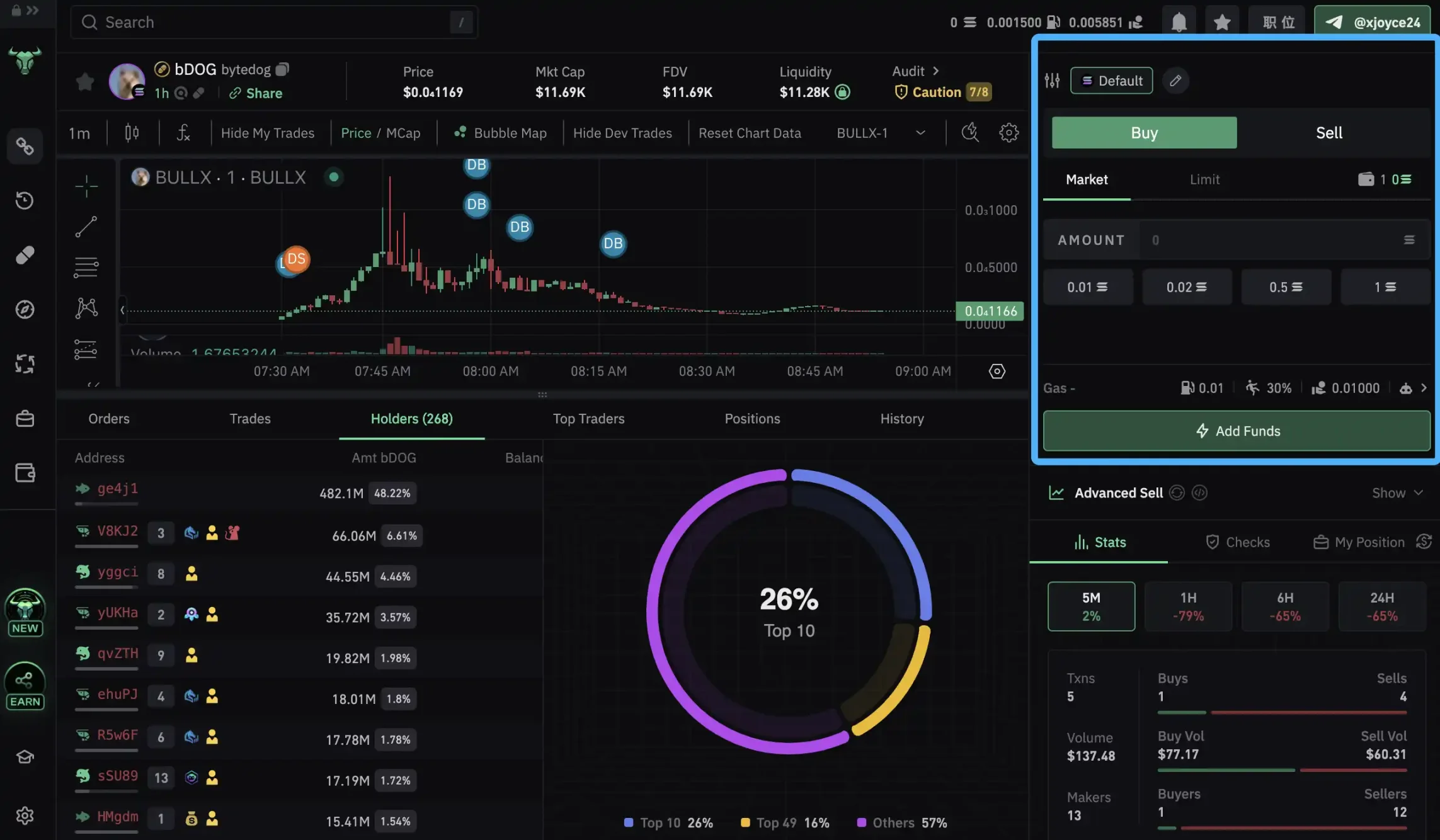 GMGN displays the real-time profit situation near the trading operation button, which can assist users to decide the need to sell based on the profit situation. Another tool can provide functions such as multi-wallet synchronization operations and random amount transactions within a set range, which is suitable for users with more customized transaction needs. Bullx allows users to place trading orders, but considering that the liquidity of meme trading pairs is generally not deep enough, for some meme players, the placing order function is of little practical use.