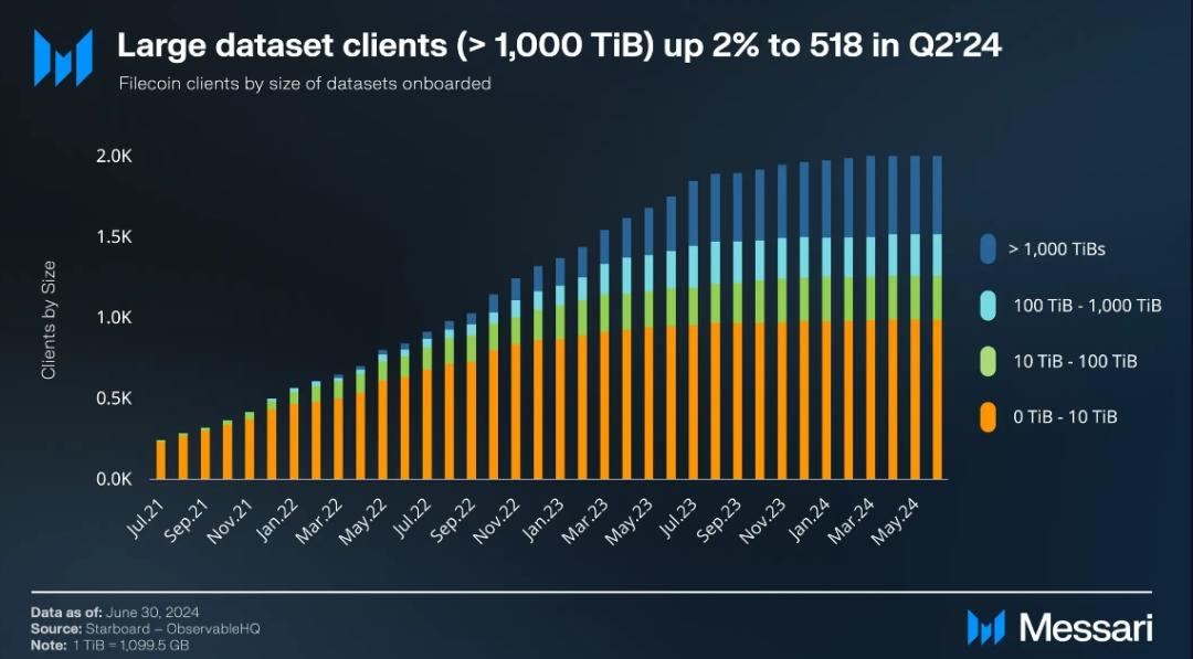• As of the end of the second quarter, 2,034 users had stored data sets on Filecoin, of which 518 users had stored large data sets of more than 1,000 TiB, a 2% increase from the previous quarter.