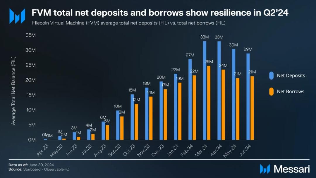 Meanwhile, according to the FVM DeFi leaderboard (https://fvm.starboard.ventures/explorer/leaderboard), the average net borrowing in DeFi was 21 million FIL (about $95 million) in June 2024. While both deposits and borrowing grew in the first quarter, they cooled down in April. This cooling was mainly due to the overall risk-averse market environment and the cessation of the stFIL loan program.