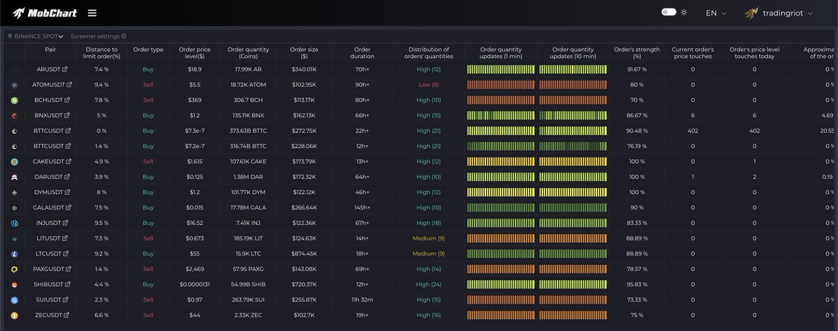 for finding opportunities in different altcoins, you can use the liquidity screener from @MobChartCrypto where you can apply various filters based on size/order strength and so on until you end up with something like this