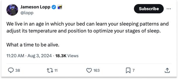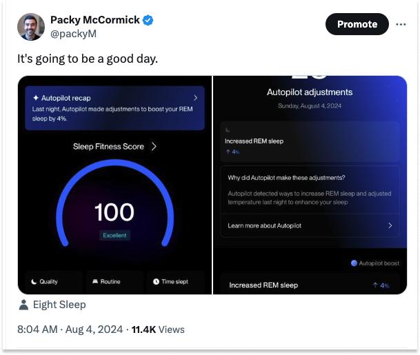 It didn’t click for me for a long time. I’ve been sleeping on an Eight Sleep Pod for over two years. The company has sponsored this newsletter. I had coffee with Eight Sleep’s co-founder, Matteo Franceschetti, in Miami as far back as 2021. I listened to him say that something like this was the goal on an old episode of Invest Like the Best. And certainly, I’ve seen all of the tweets from Eight Sleep fanboys.