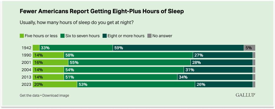 At that dinner, Matteo and Max discussed how bad Matteo’s sleep had gotten – so bad that he experimented with polyphasic sleep, a combination of ~90 minute sleep with short naps on a strict schedule – and his desire to get the benefits of a full eight hours in just six. They talked about how bad Americans’ sleep had gotten generally. At the time, only 34% of Americans were getting their eight hours, down from 59% in 1942. It’s only gotten worse since.