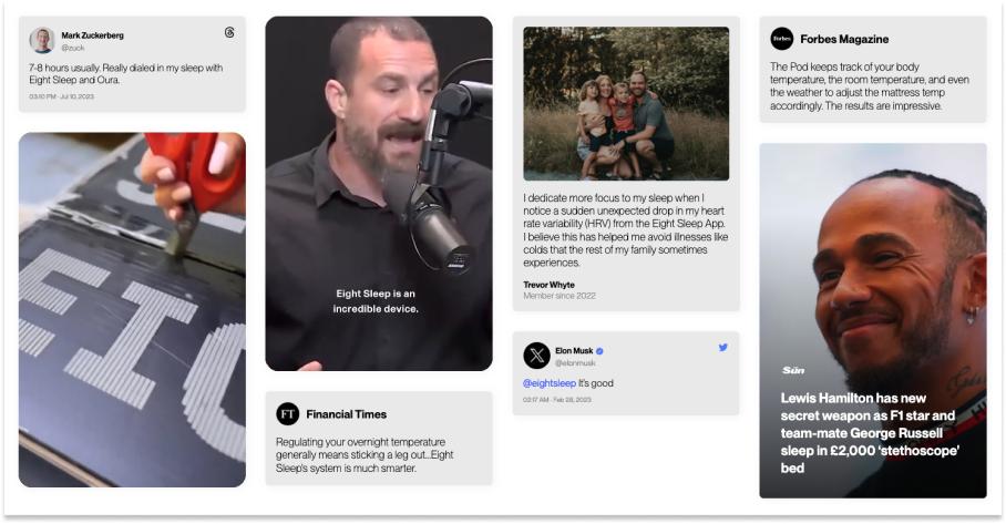 Last comes performance marketing, like Facebook/Instagram Ads, YouTube ads, Google search ads, and the like, designed to get you to actually click over to Eight Sleep’s website and buy. “For us,” Matteo explained, “performance marketing is just the ability to convert the work we’ve done with our product and aspirational brand.”