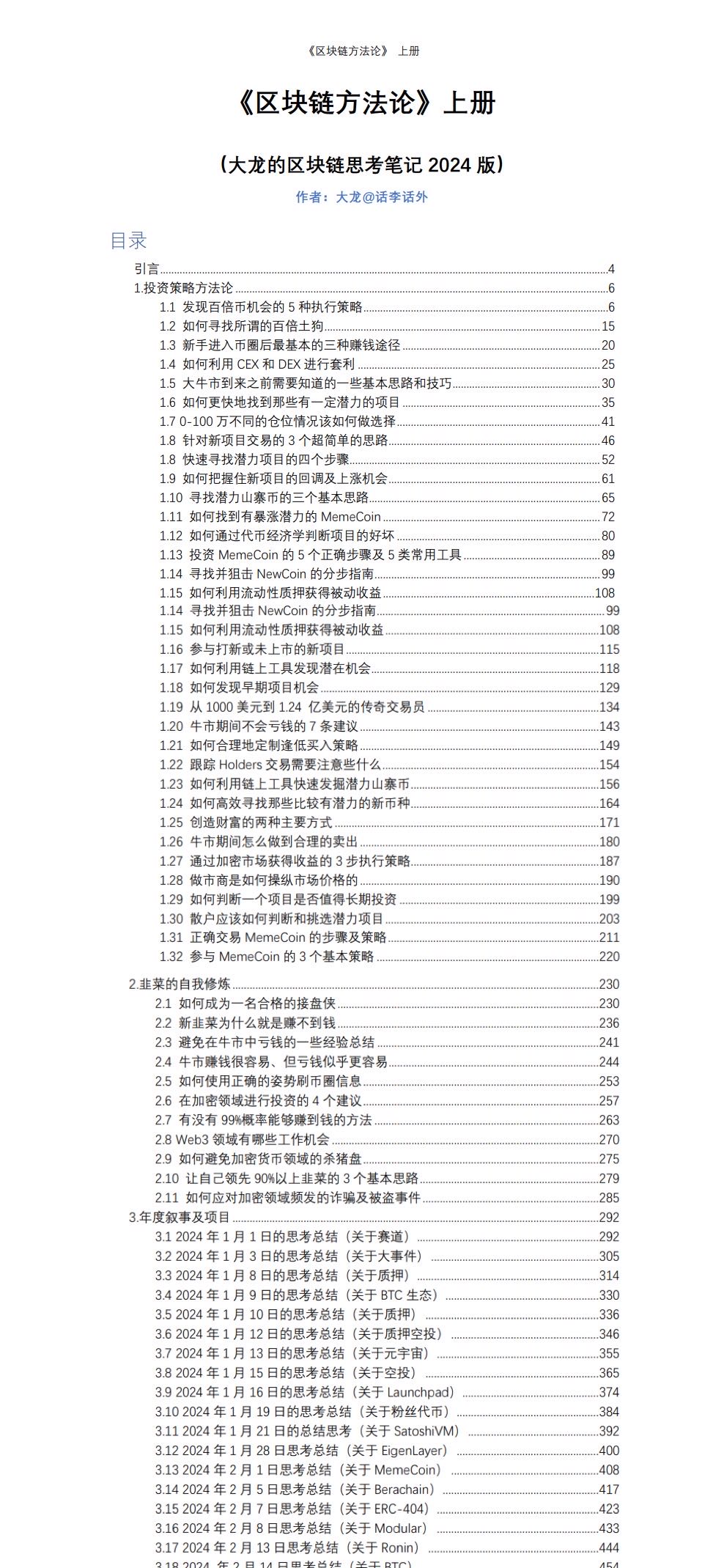 This book is the second e-book of Huali Huawai, which is divided into two volumes. The first volume was launched on June 20, 2024 (a total of 343,000 words), and the second volume will be launched on December 30, 2024. "Blockchain Methodology" (Dalong's Blockchain Thinking Notes 2024 Edition) is mainly divided into three categories: investment strategy methodology, self-cultivation of leeks, annual narrative and projects. Each category is composed of different sub-sections.