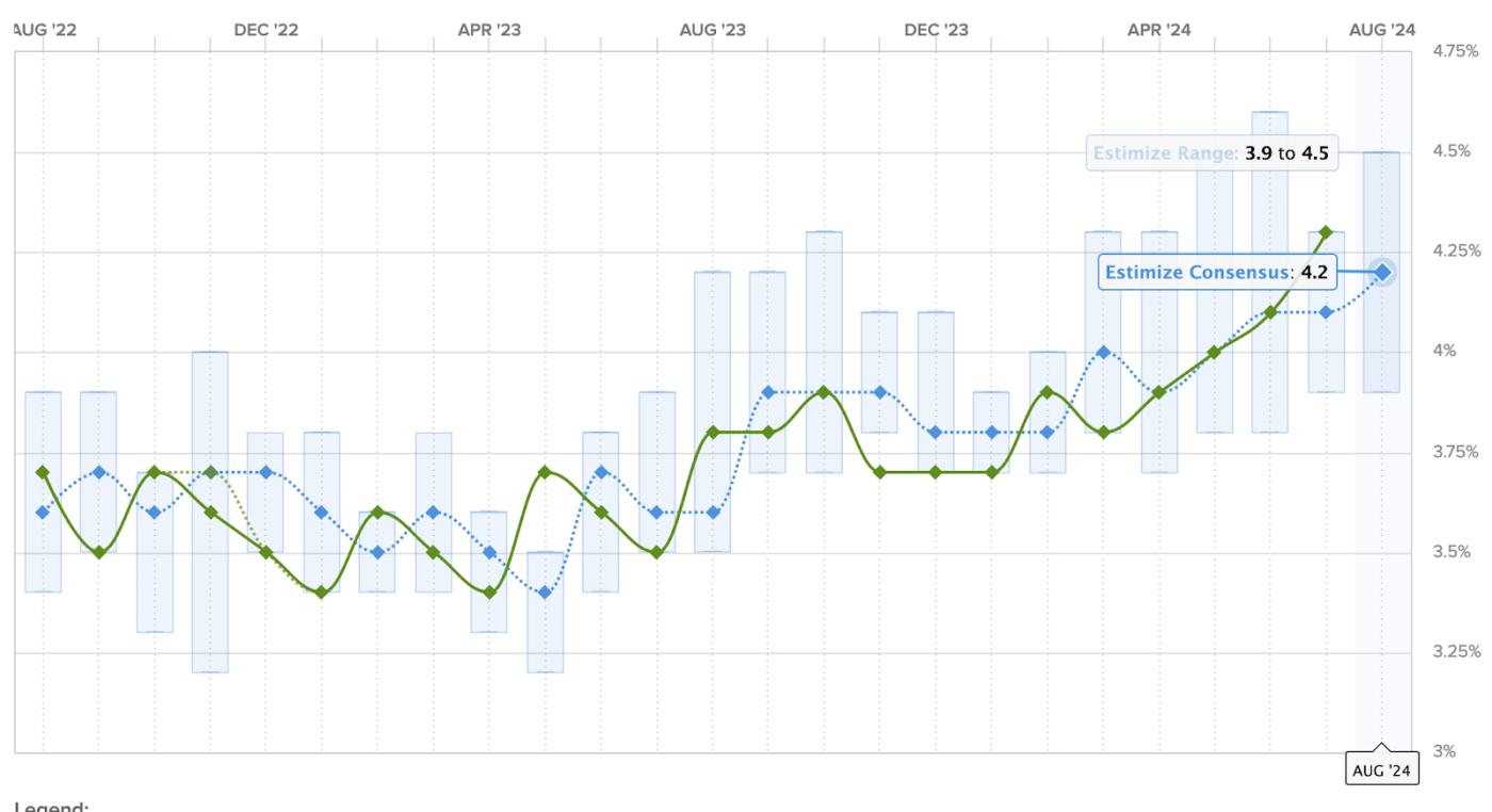 - Below 4.2% print: Likely a cut of 25 basis points and potentially more hawkish signaling in terms of the pace of rate cuts moving forward.