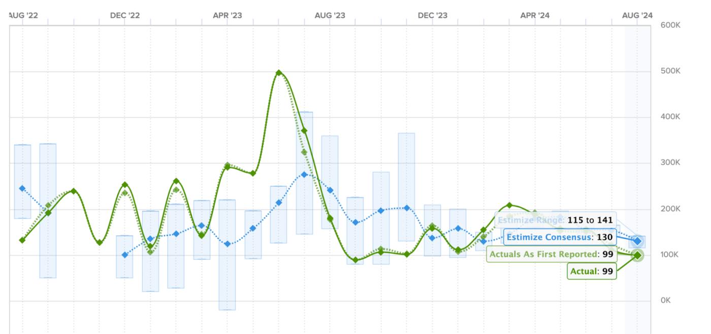 - Last month, the unemployment rate came in at 4.3%, significantly above the consensus estimate of 4.1%. Although part of it was due to a surge in temporary layoffs that should revert quickly, it shocked the market into being concerned about a recession looming closer than most anticipated.