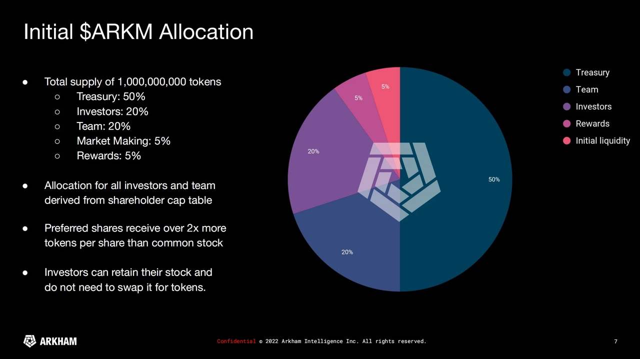 The distribution is as follows: Treasury: 50% (500,000,000 ARKM) Investors: 20% (200,000,000 ARKM) Team: 20% (200,000,000 ARKM) Market Making: 5% (50,000,000 ARKM) Rewards: 5% (50,000,000 ARKM)