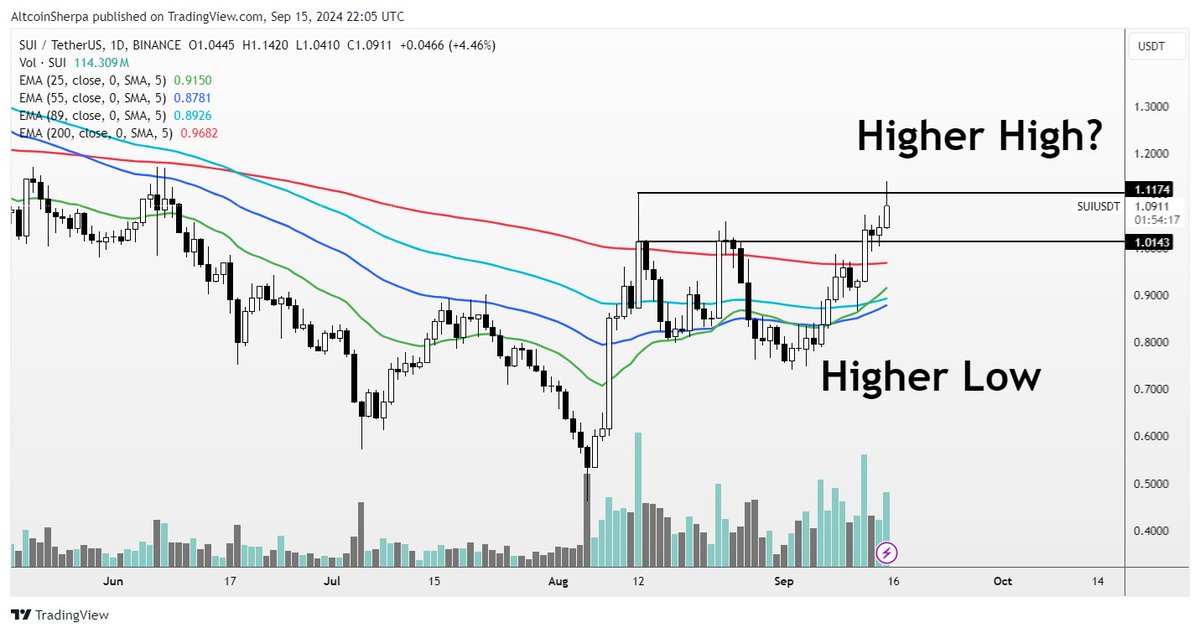 $SUI decent one to trade. don't think much about it long term given unlocks/everything else but in the mid term it looks like you should only be longing this thing. higher low + 1d EMAs all strong.