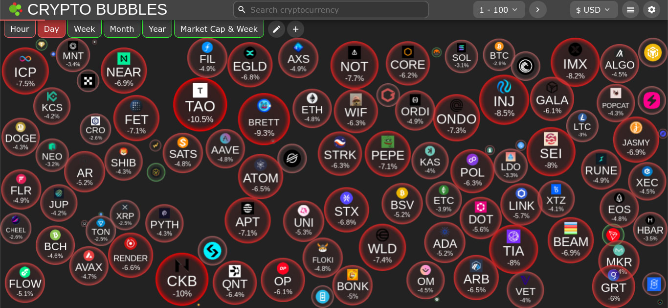Chains are quite red today. Only top 25 chains green on the daily are Sui (#10), Hyperliquid (#12), and Core (#22).
