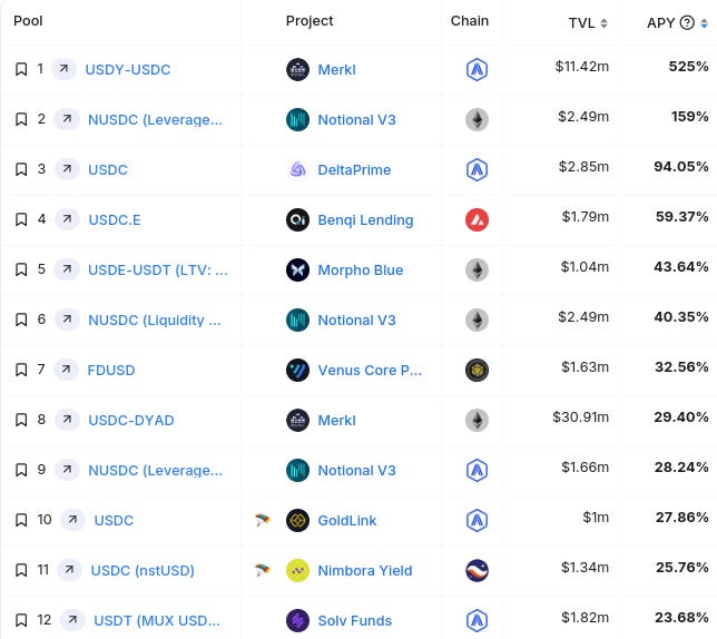 (note: these are the top Stablecoin Yields, sourced from @DefiLlama (all types, $1M+ TVL only) - note: these lists are just raw data, make sure to always DYOR before interacting with any/all protocols)