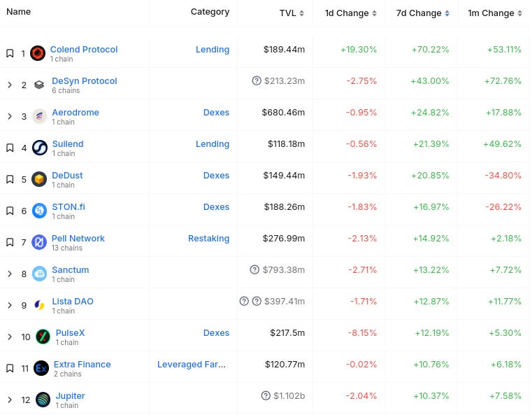 Here’s The Top 12 Top-Performing Chains By TVL On The Weekly With At Least $100M TVL (from @DefiLlama):