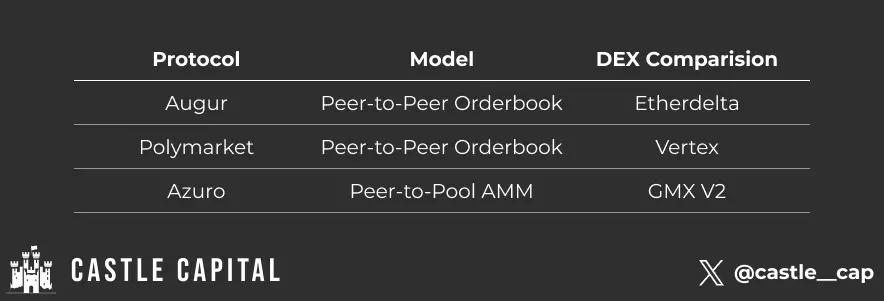 Augur seemed ahead of its time, like Etherdelta, building a traditional order book product on a chain that had not yet scaled or reached sufficient performance. Polymarket initially leveraged Uniswap's success in the constant product formula for a better user experience, and then transitioned to an order book, similar to Verterx. Finally, Azuro implemented a peer-to-peer pool model similar to GMX, which allows Azuro to evenly scale liquidity across all markets, have deep pools serving multiple markets, and abstract complexity away from users.