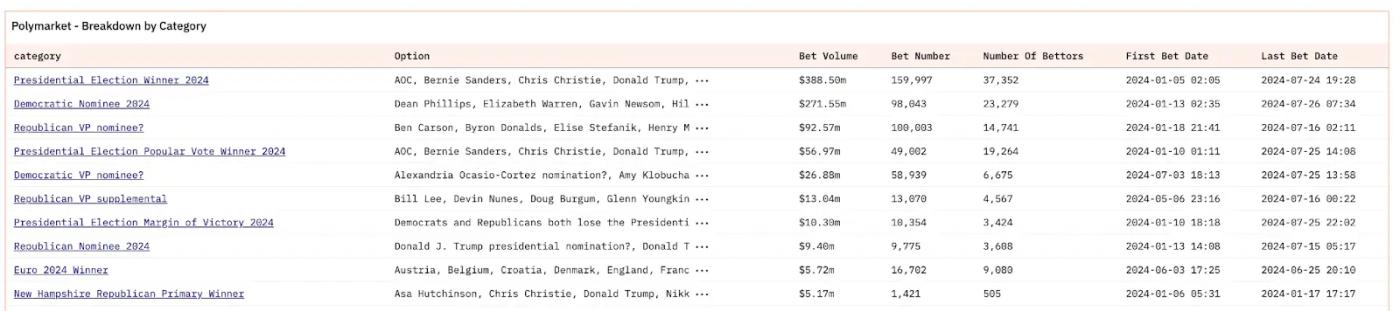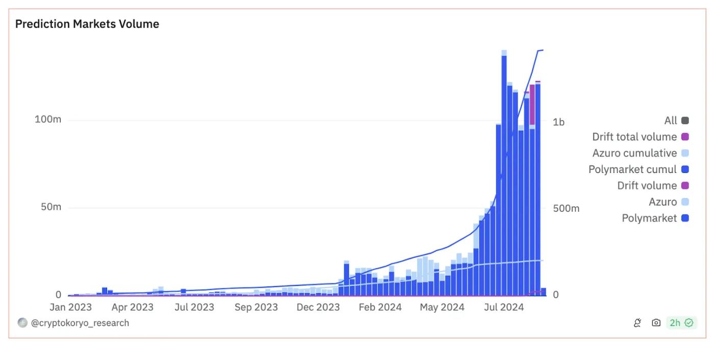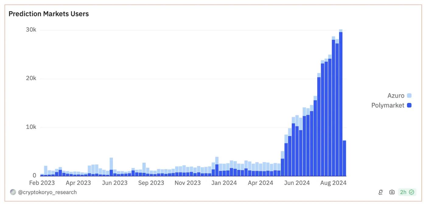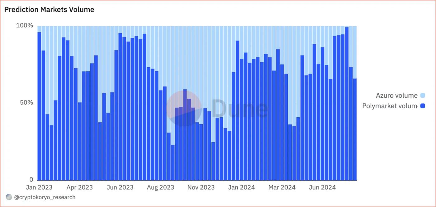 Prior to the US election narrative, Azuro was a leader in the space due to its offering of sports-related markets. However, the US election became the main driver of the recent success of prediction markets, dominated by Polymarket. At the same time, since Azuro relies on sporting events, which have a break during the summer, its trading volume slows down in the summer.