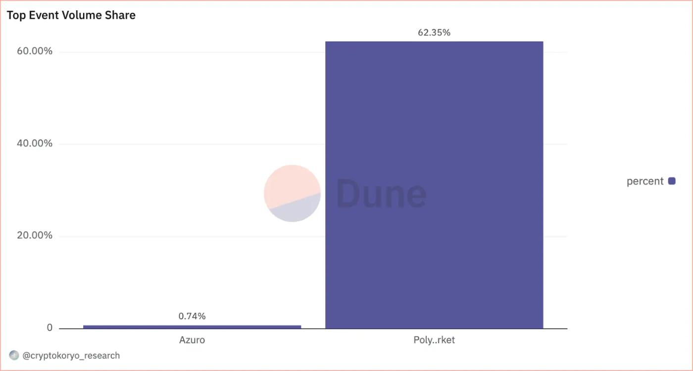 While Polymarket thrives on large but limited number of markets, attracting strategic narrative speculators, they are likely using Polymarket as a one-time use, i.e. they come to the market specifically to bet. Azuro, on the other hand, offers many smaller markets, drawing users back and converting them into repeat customers. On Polymarket, top events account for 62% of total volume, while on Azuro, this is just 0.74%. This highlights how Polymarket positions itself to capture the biggest “news” events, while Azuro’s offering, in contrast, includes multiple smaller events, more suitable for repeat betting.