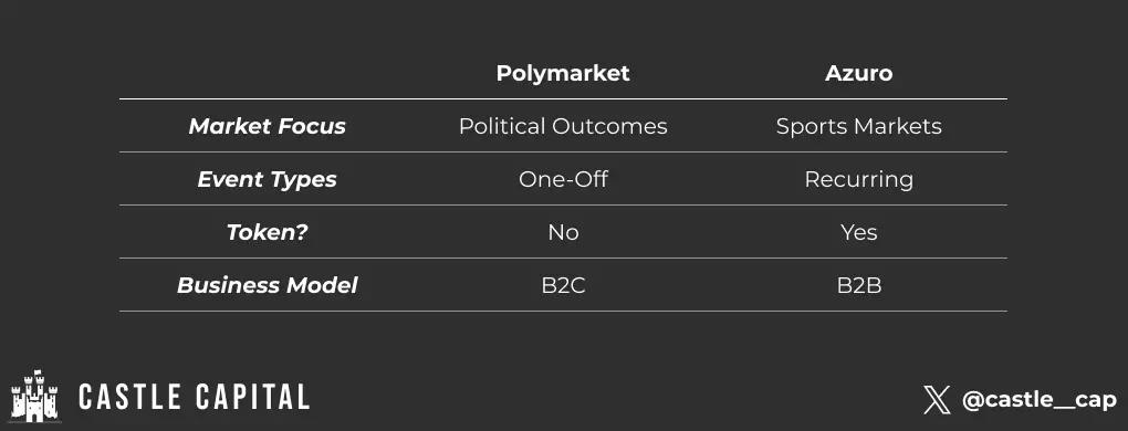 The platforms are complementary rather than competing. Azuro is more focused on B2B and recurring sports events, while Polymarket is more focused on B2C and news, politics and economic events.