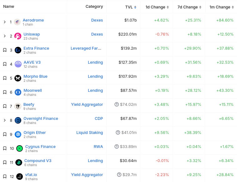 Here’s The Top 12 Protocols On Base By TVL (from @DefiLlama):