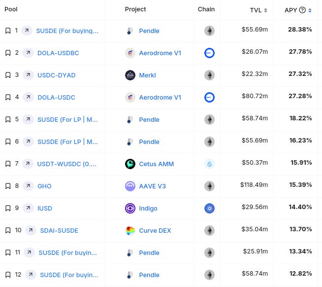 (note: these are the top Stablecoin Yields, sourced from @DefiLlama (all types, $20M+ TVL only) - note: these lists are just raw data, make sure to always DYOR before interacting with any/all protocols)