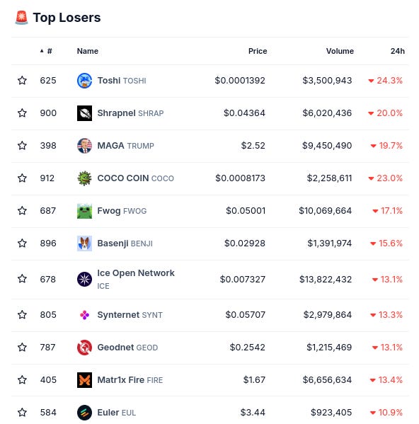 Protocols are also mixed today. Fastest-growing protocols on the weekly with at least $20M TVL are ETH Mainnet lending protocol Flux Finance, ETH Mainnet liquid-staking protocol Treehouse Protocol, Cardano dex Splash Protocol, multichain (EVM) yield protocol Toros, and multichain (EVM) index protocol dHEDGE.