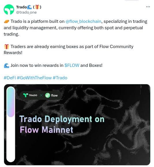 -New derivatives protocol on Flow called @trado_one has been added to @DefiLlama. Twitter bio states “One-Stop Trading Platform with Spot and Perp on @flow_blockchain”. Followed by 1 of our mutuals.