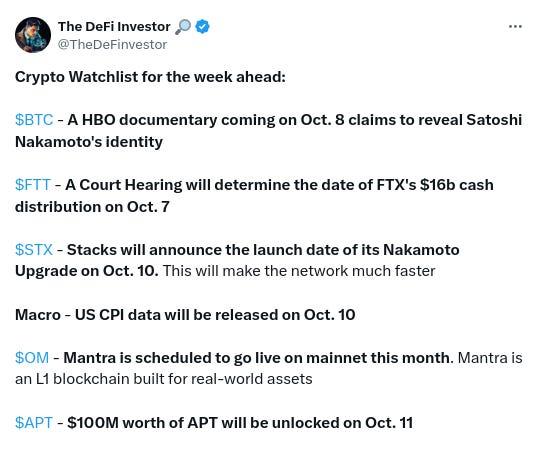 -Crypto watchlist for the week ahead, h/t @TheDeFinvestor: