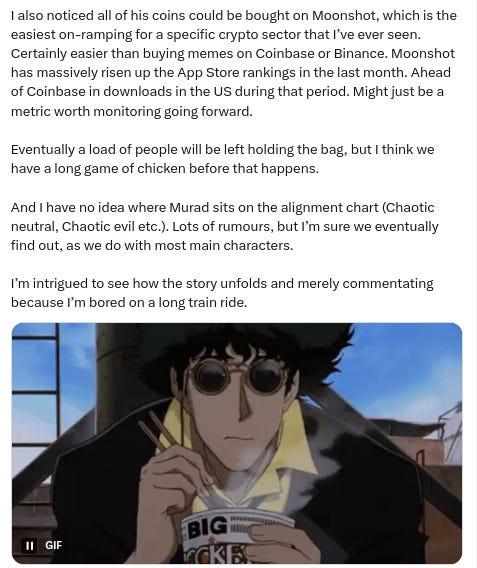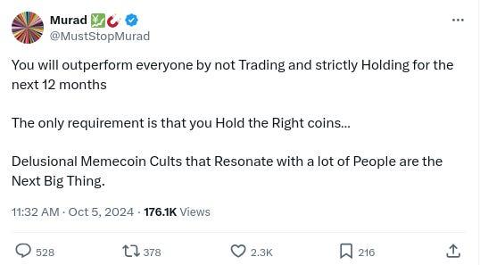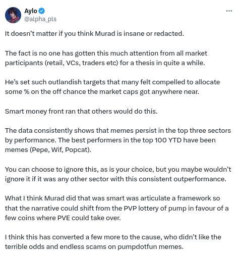 -@MustStopMurad and his ‘Memecoin Thesis’ have been the dominant topic of conversation on CT the last few days: