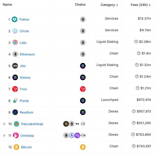 Here’s The Top 12 Entities By 24 Hour Fee Generation (from @DefiLlama):