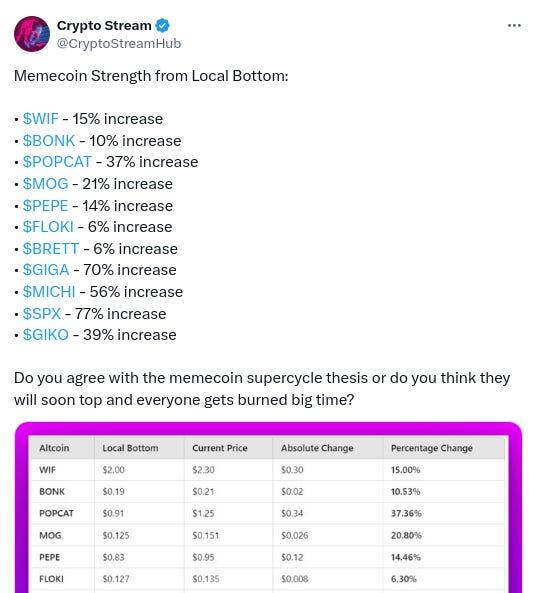-Memecoins seeing decent pump since recent bottom, h/t @CryptoStreamHub: