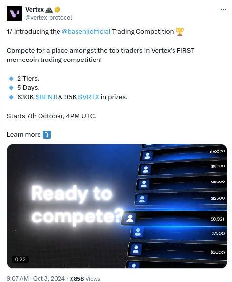 This is Vertex’s first memecoin trading competition and involves the new token BENJI on Base!