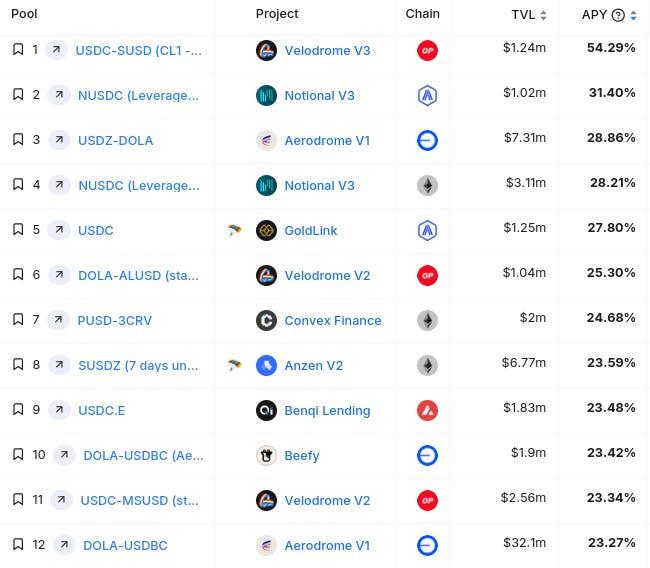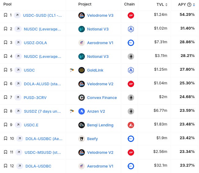 (note: these are the top Stablecoin Yields, sourced from @DefiLlama (all types, $1M+ TVL only) - note: these lists are just raw data, make sure to always DYOR before interacting with any/all protocols)