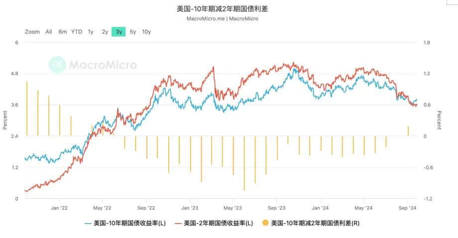 Along with the interest rate cut, the U.S. bond market also saw a trend change. Concerns about the long-term development of the U.S. economy have caused the yield of 2-year Treasury bonds to be higher than that of 10-year Treasury bonds since July 2022. This trend was reversed in September, and the interest rate spread between 10-year and 2-year Treasury bonds has returned to positive at 0.16. This means that Treasury bond investors have initially confirmed the "soft landing" of the U.S. economy.