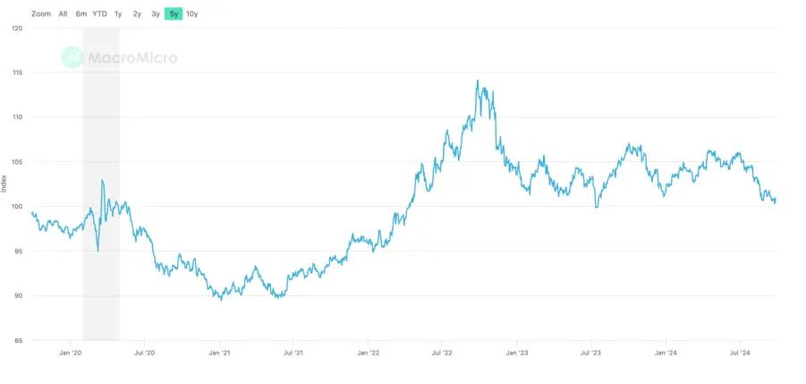 After the rate cut started, the US dollar index rebounded slightly and then resumed its downward trend. By the end of the month, it approached the 100 mark again, returning to the point in April 2022. As the rate cut continues, it may only be a matter of time before it falls below 100.